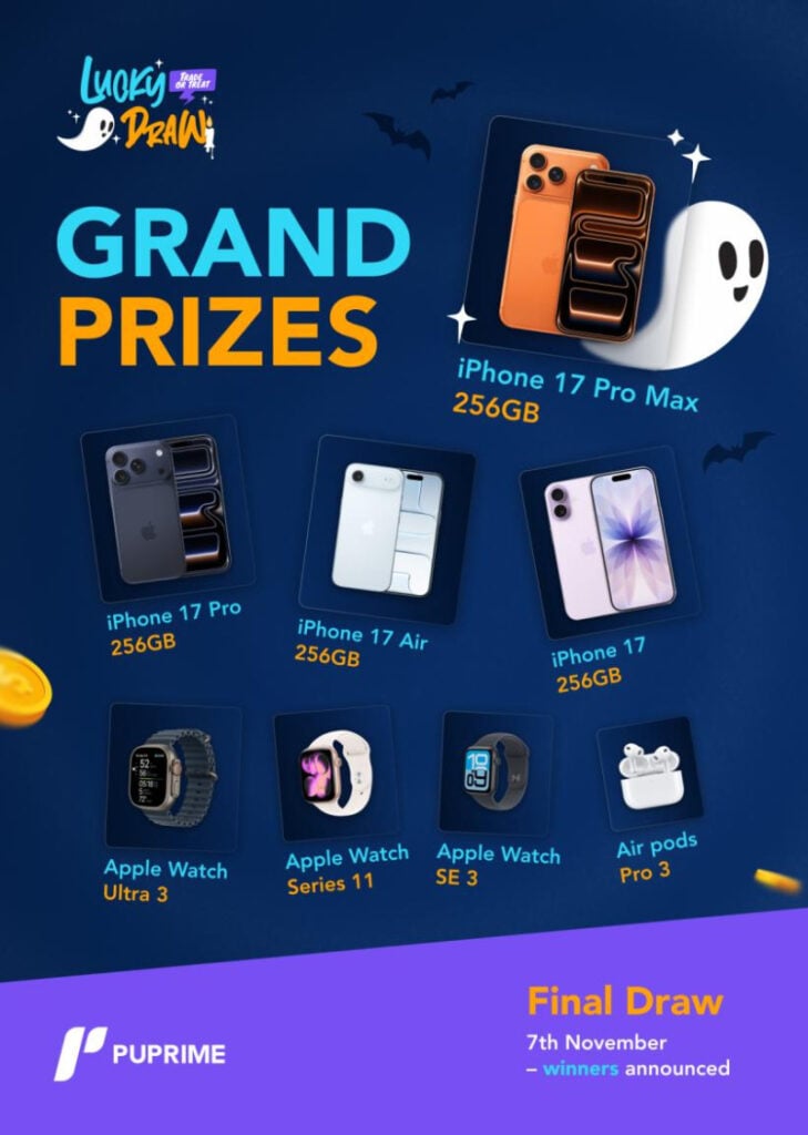 PU Prime has launched its Halloween Lucky Draw Promotion, running from 1 – 31 October 2025. With every qualifying trade, participants stand a chance to win premium Apple products and weekly cash rewards, adding festive excitement to the trading journey.